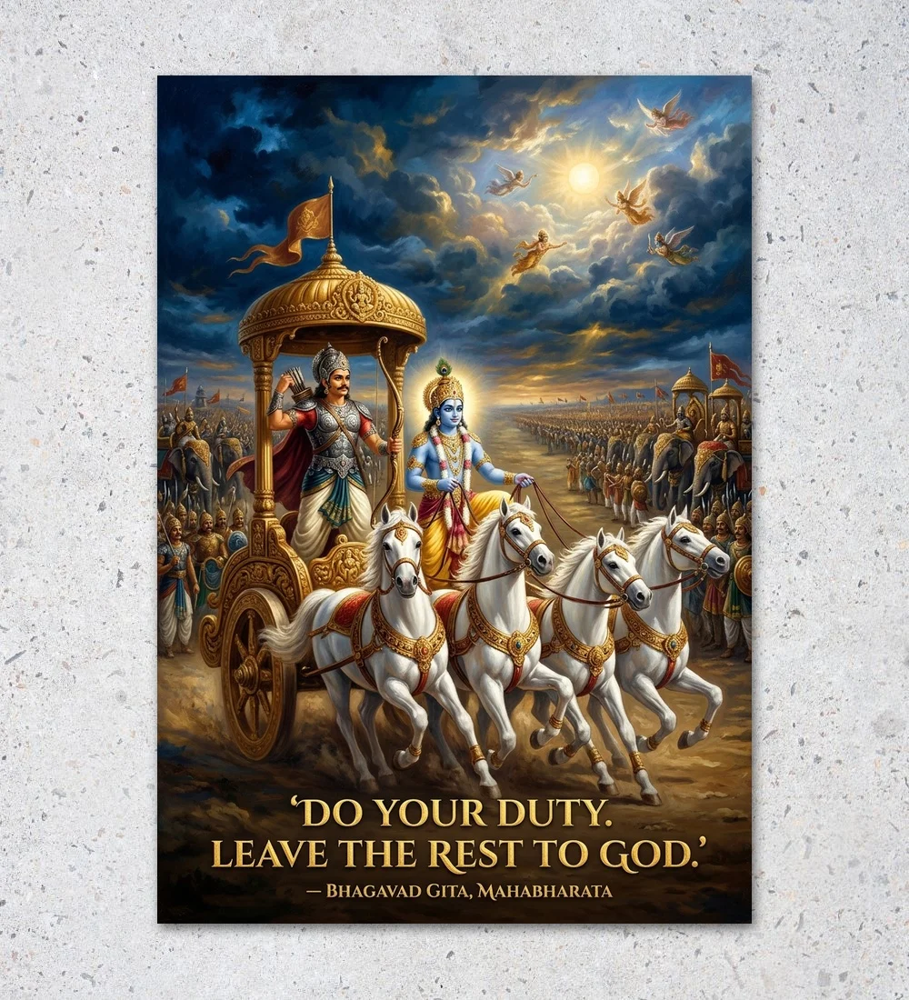 A powerful poster inspired by the Bhagavad Gita, capturing the timeless moment of Krishna guiding Arjuna through duty and faith. With rich golden tones, dramatic skies, and a sense of divine movement, this poster brings clarity, courage, and calm into your workspace.