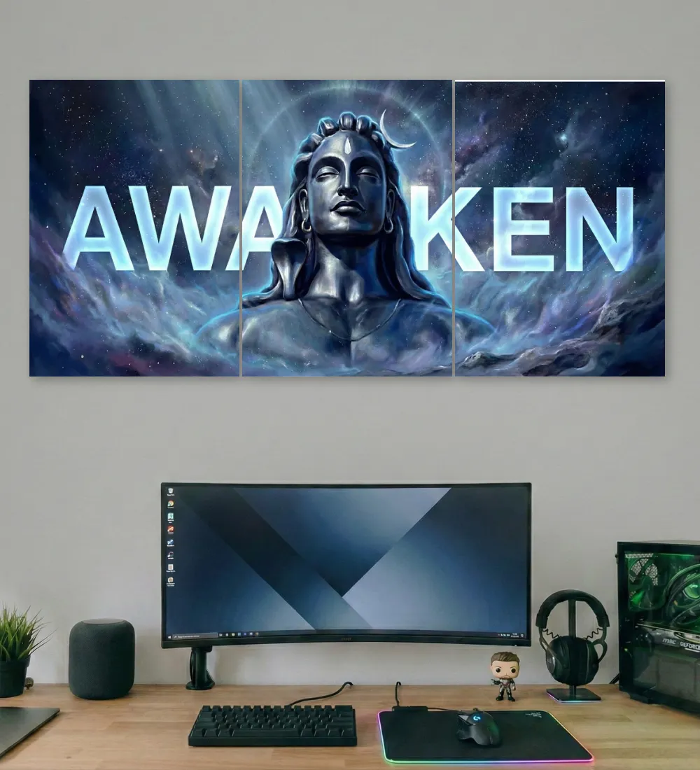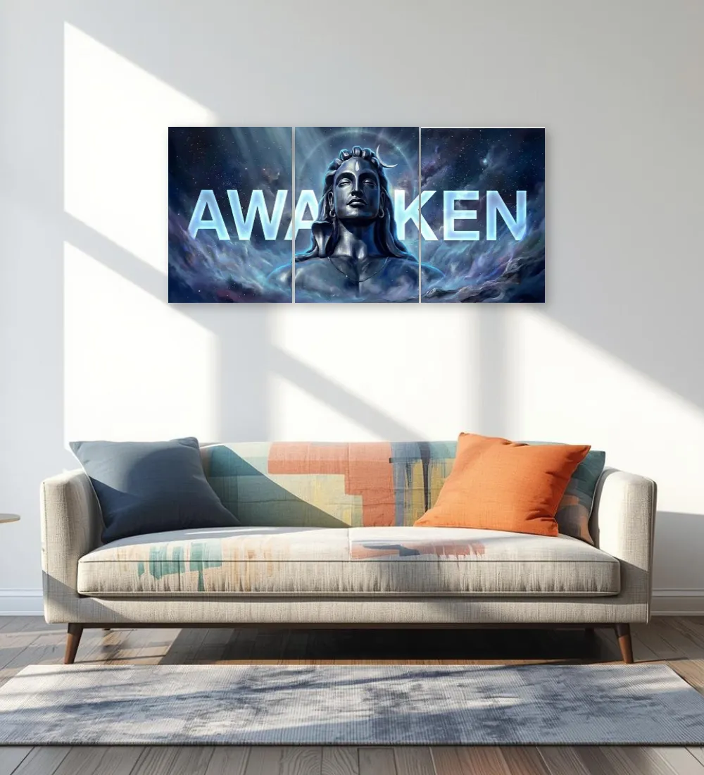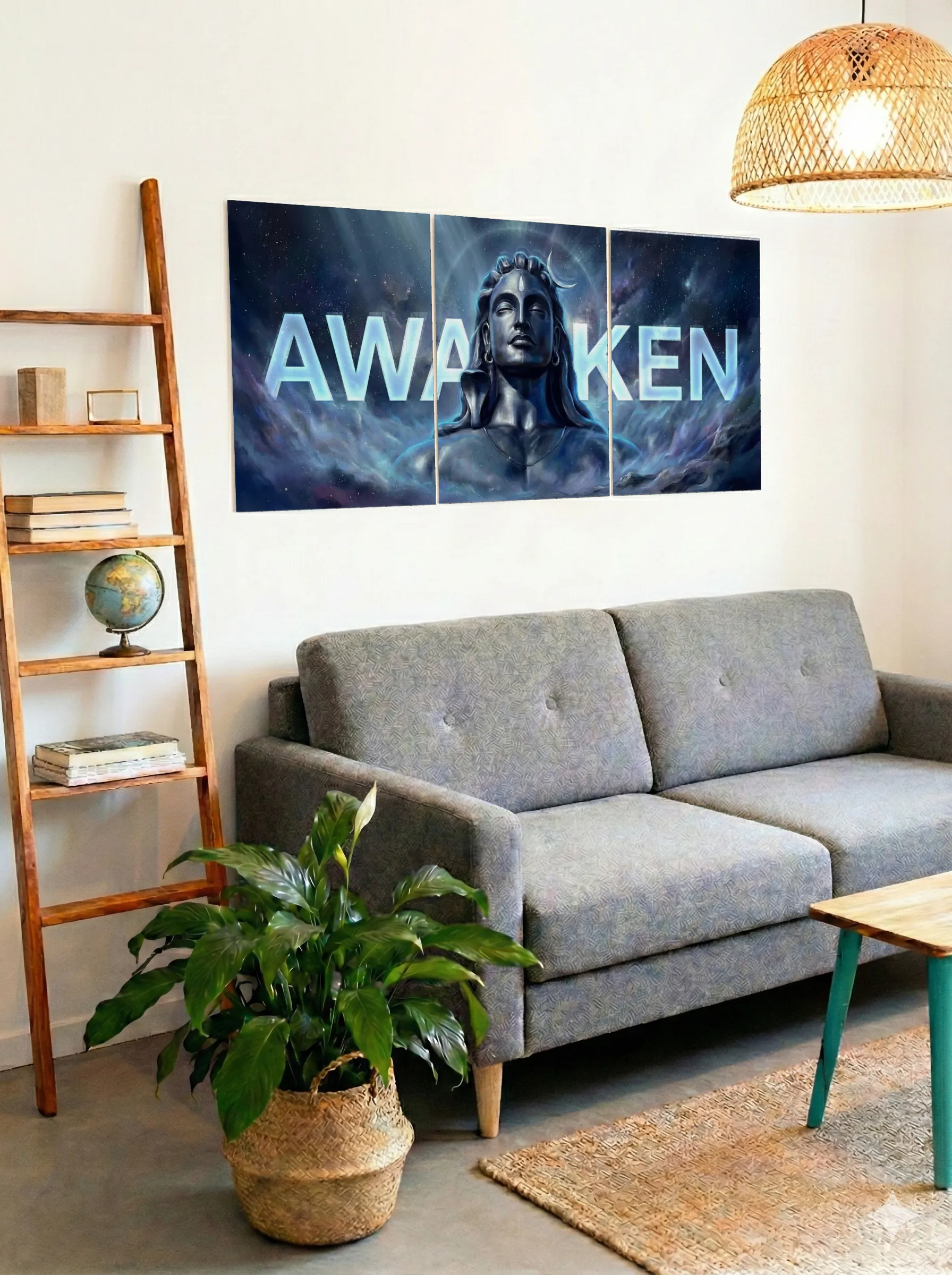 Featuring a serene depiction of Shiva surrounded by cosmic skies and luminous blue tones, this three-panel poster set represents awakening at a deeper level. The bold word “AWAKEN” stretches across the panels, acting as a daily reminder to activate your potential, sharpen your awareness, and rise above distractions.