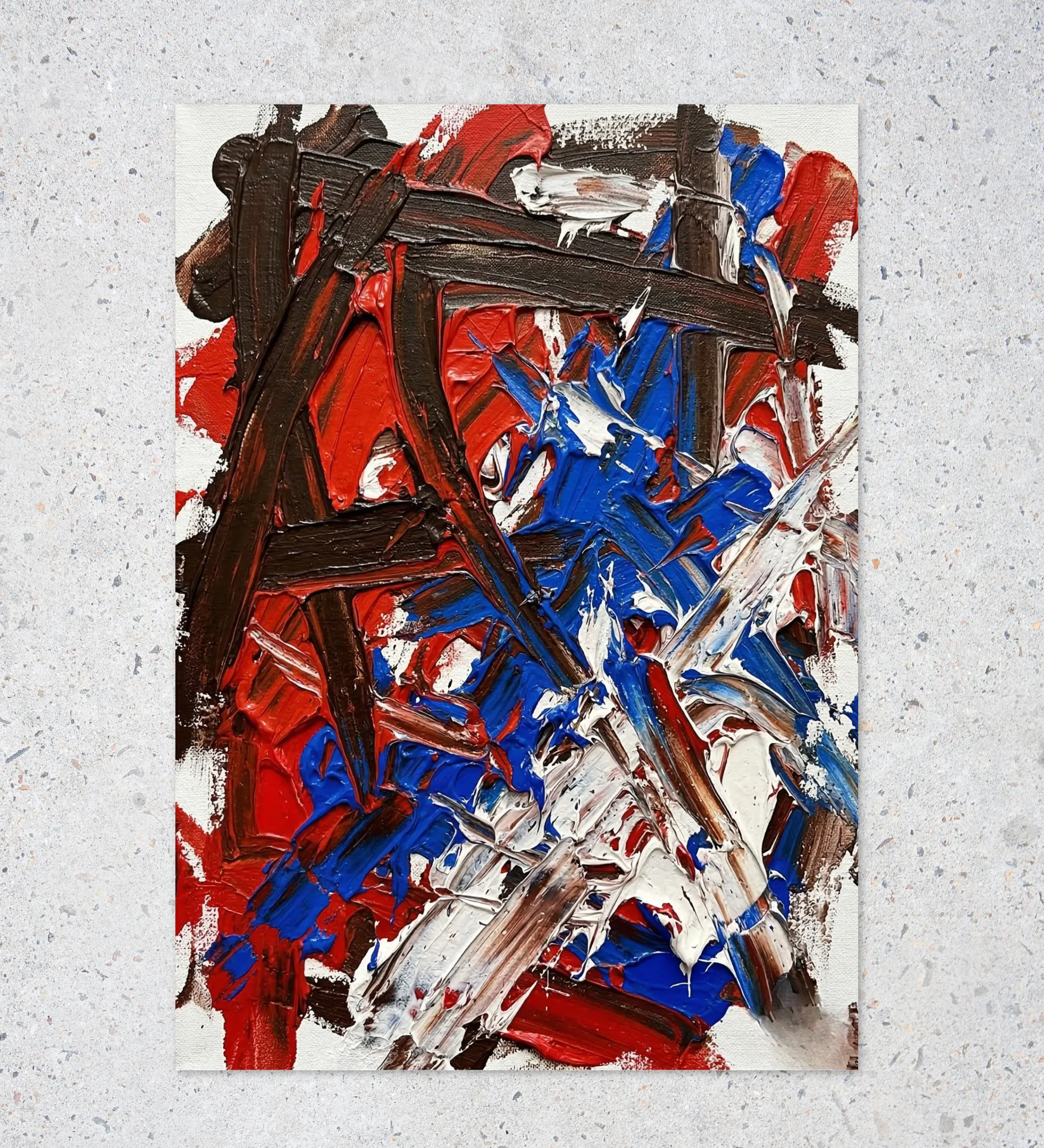 A raw and energetic abstract poster with bold brush strokes in red, blue, black, and white—perfect for adding intensity and artistic depth to your space.