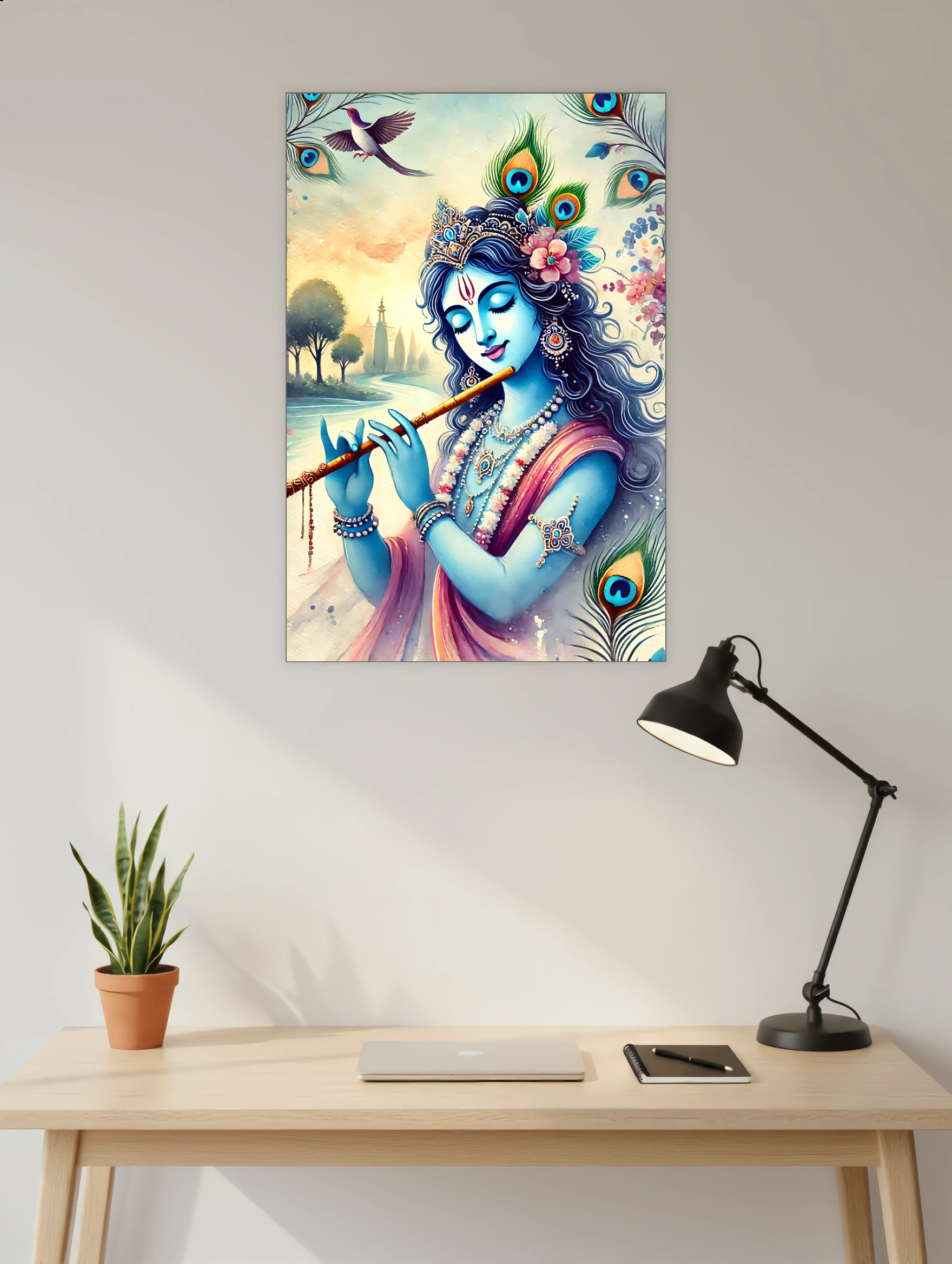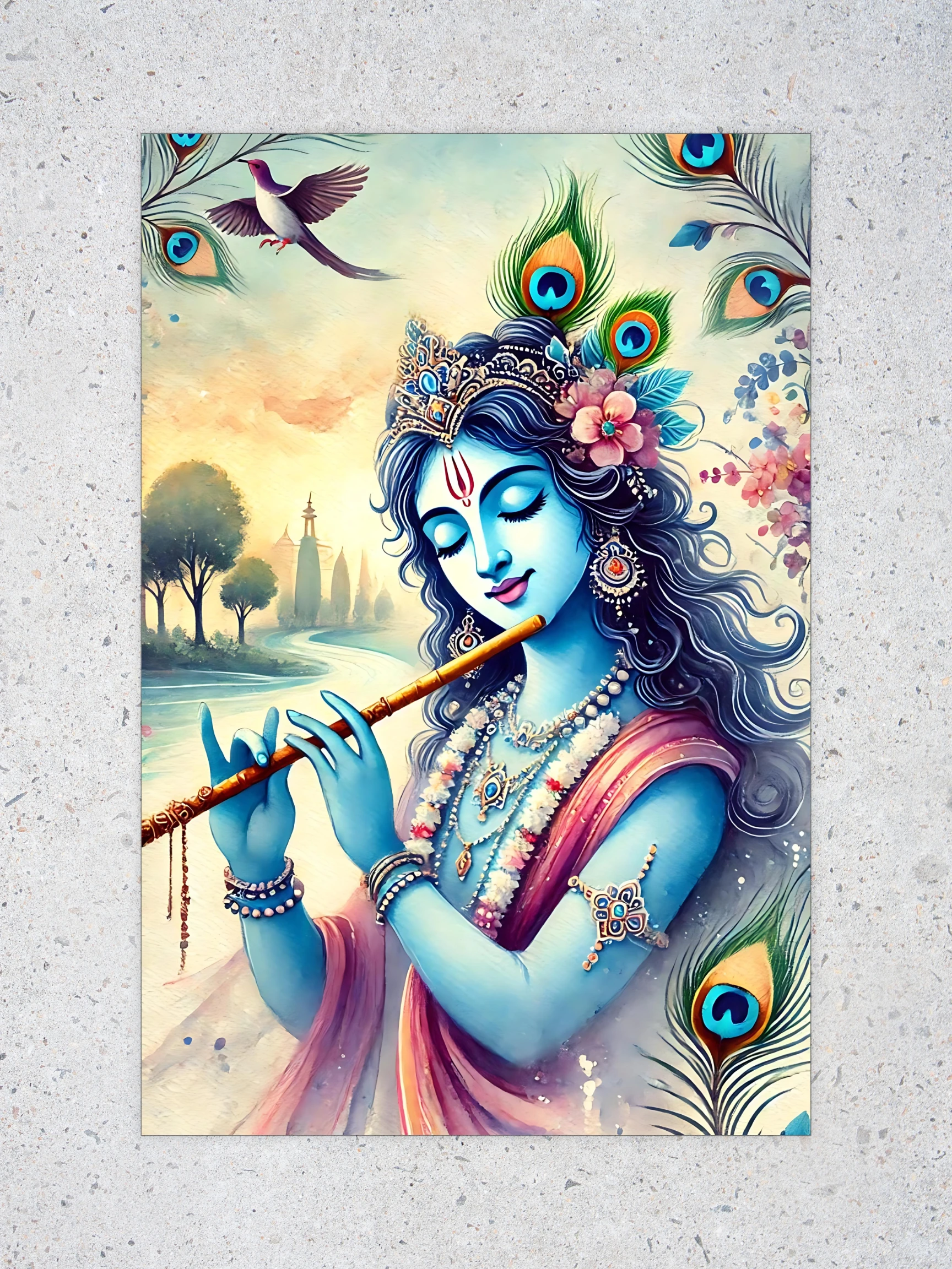 Introducing the exquisite Shree Krishna with Flute Poster a masterpiece crafted with precision and care This poster boasts stunning K quality ensuring every detail of the artwork is vivid and crisp Made from high-quality – GSM Art Board this poster is durable and has a luxurious feel The fade-proof print guarantees long-lasting beauty preserving the artwork’s vibrancy for years to come.