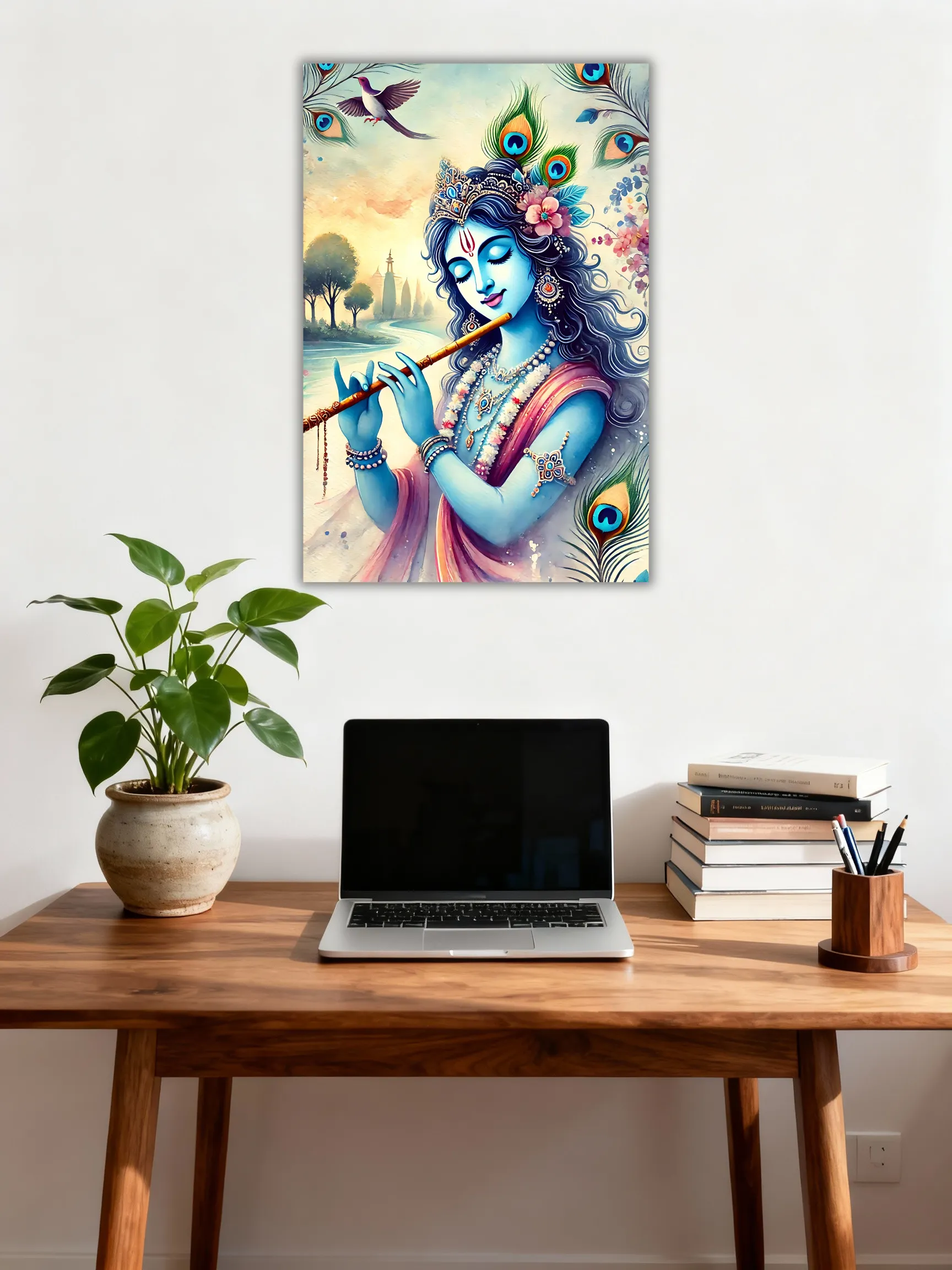 Bring the divine aura of Lord Krishna into your space with the Shree Krishna with Flute Poster This high-quality K poster is printed on – GSM Art Board with fade-proof inks for long-lasting vibrancy OEKO-TEX Certified inks ensure safety while the rolled packaging and adhesive stripes make installation a breeze