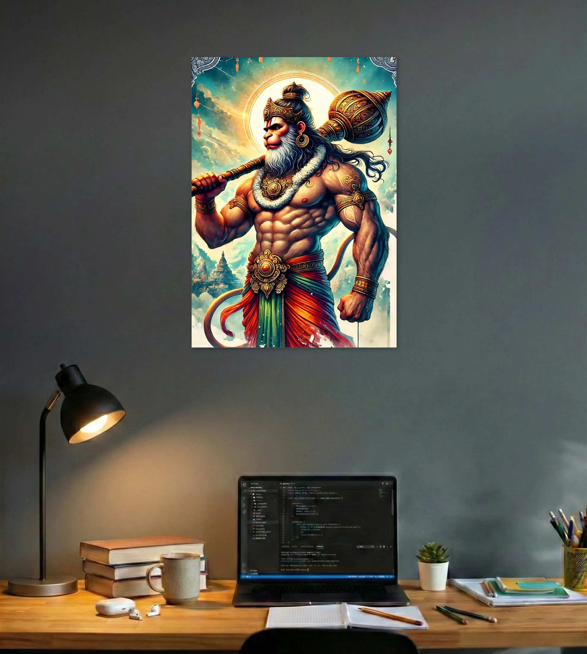 For students, creators, and professionals, this poster becomes more than wall art. It acts as a reminder of dedication, loyalty, and the unstoppable spirit that Hanuman represents. Whether placed above a study desk, near a meditation corner, or in a personal workspace, the presence of this poster quietly inspires perseverance and inner strength every day.
