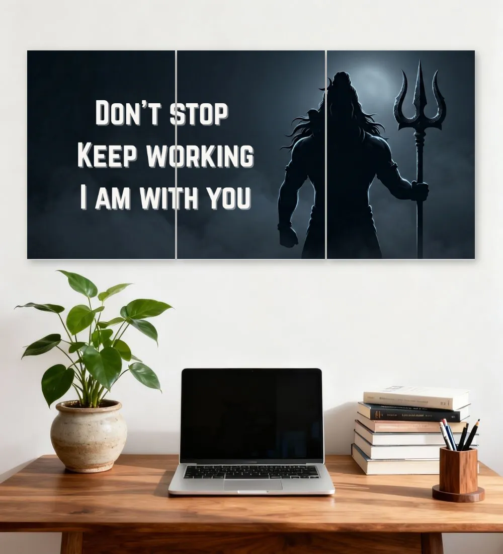Featuring a bold silhouette inspired by Lord Shiva holding the trident against a deep, moonlit blue background, this poster captures both calmness and power in one frame. The message — “Don’t Stop, Keep Working, I Am With You” — feels like a personal reassurance, encouraging you to stay consistent, grounded, and focused no matter how tough the path becomes.