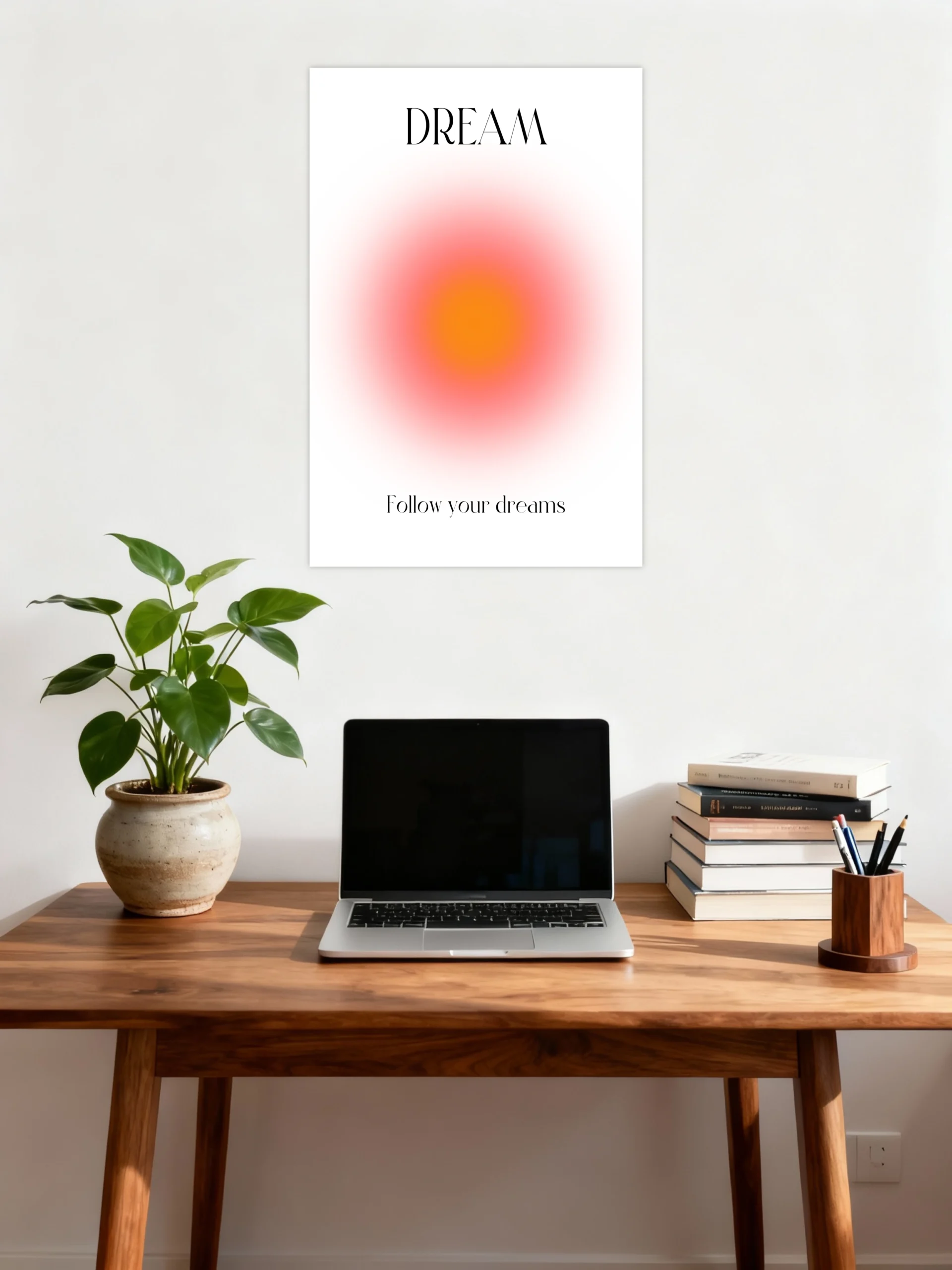 This poster is a quiet reminder to keep your dreams close, even on the busiest days. A soft glowing gradient sits at the center, like a rising inner sun, radiating warmth, clarity, and possibility. The word “Dream” stands tall at the top, while “Follow your dreams” gently grounds the message below, creating a calm balance between intention and action.