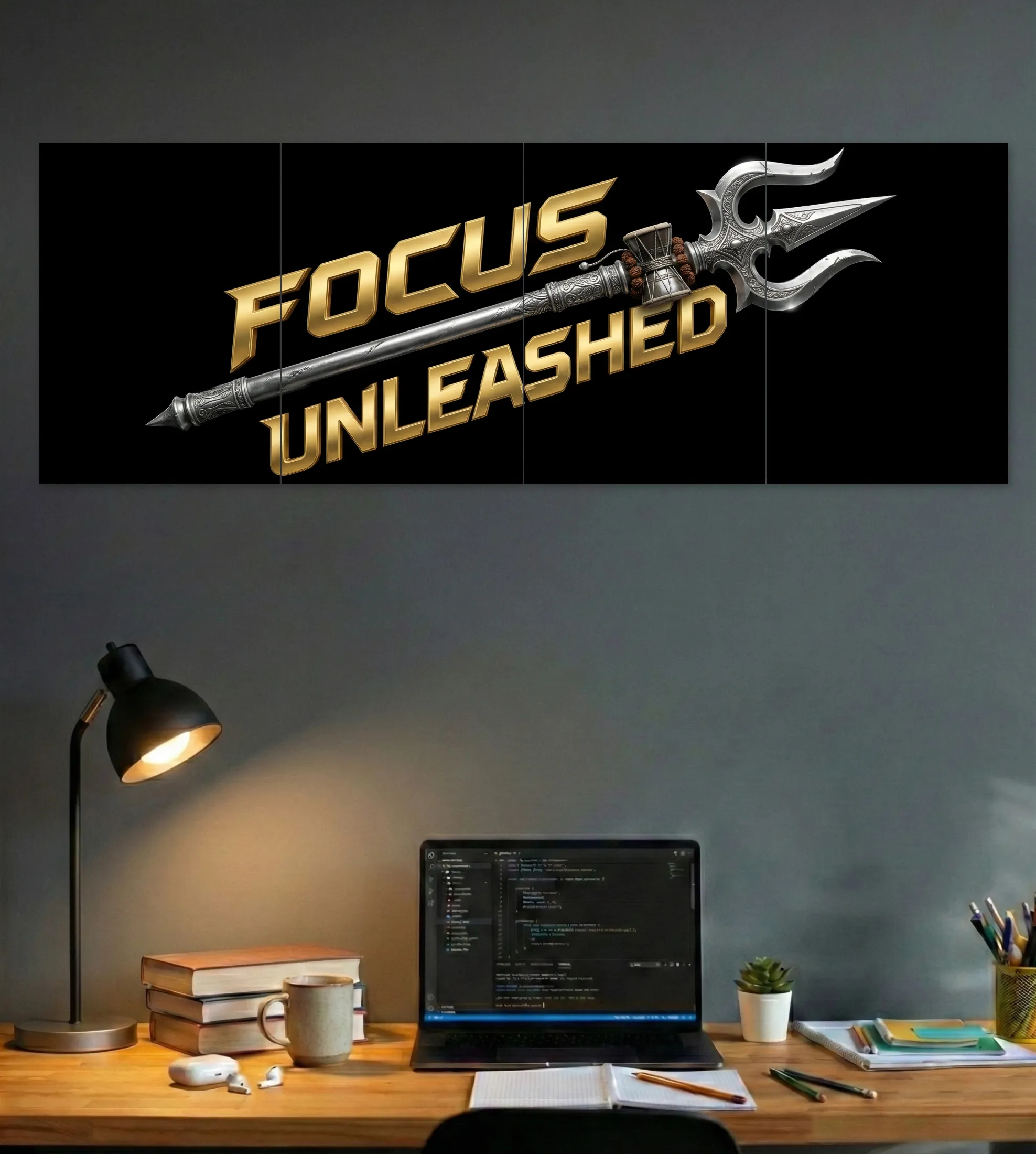 The Focus Unleashed Poster is a bold 4-panel split poster set created for those who believe focus is a superpower. Spanning across four perfectly aligned panels, the poster features powerful golden typography reading “Focus Unleashed,” intersected by a detailed trident spear that symbolizes precision, strength, and direction.