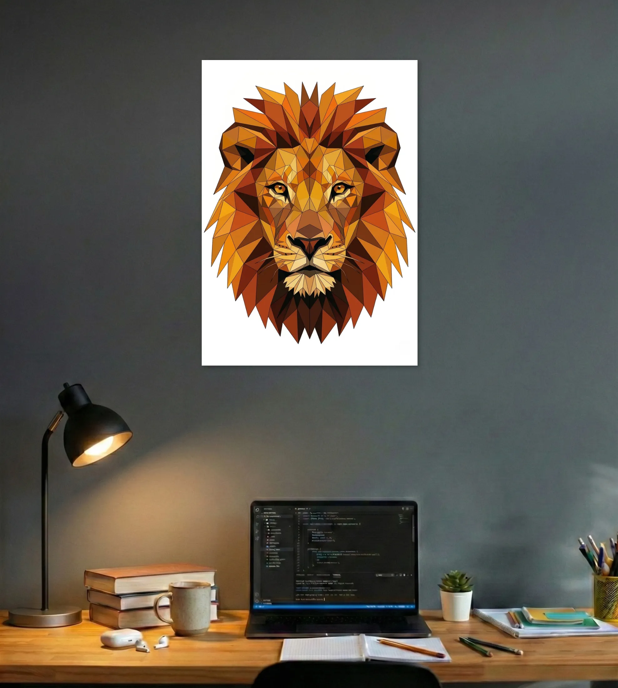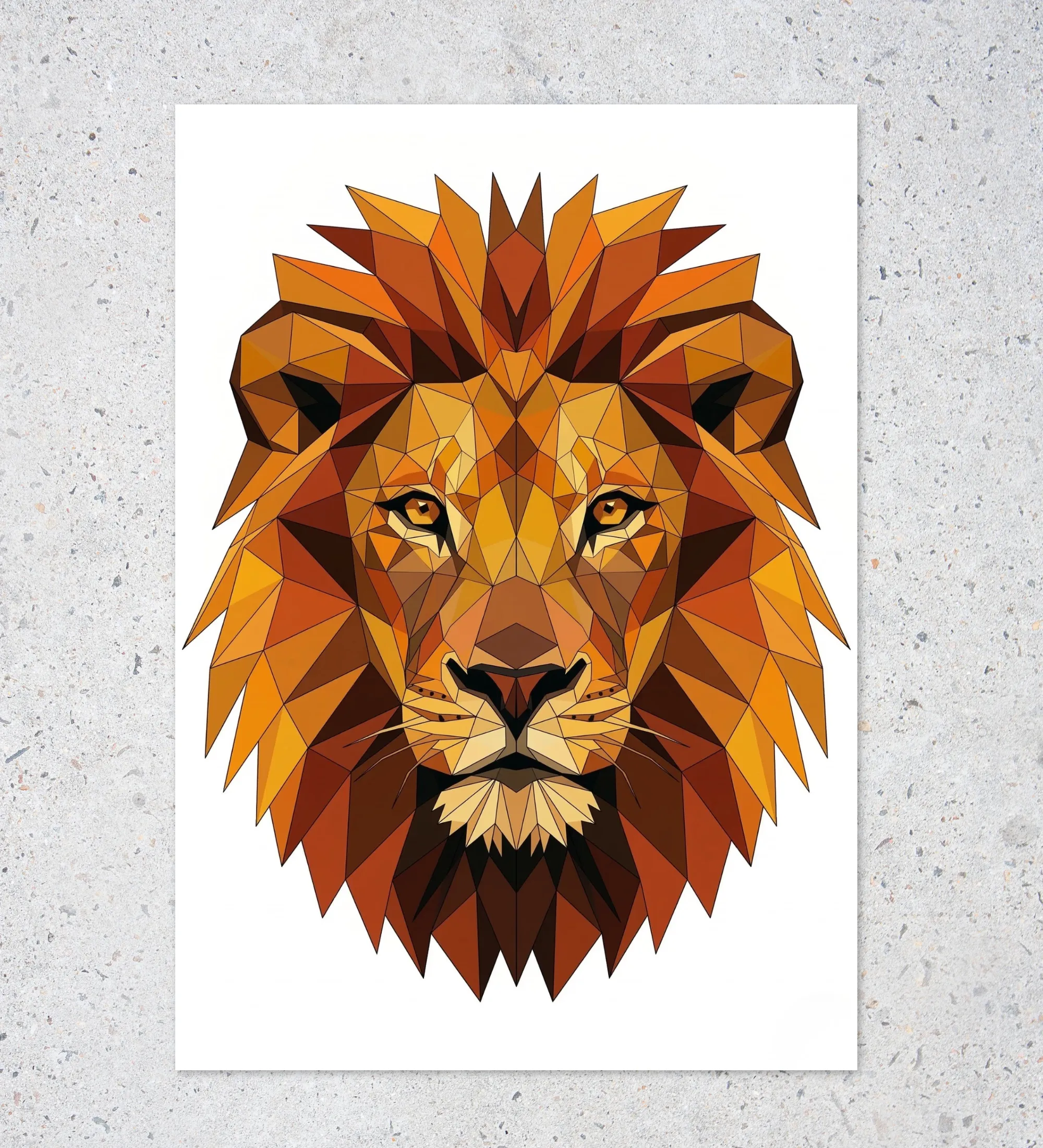 A bold lion poster crafted with geometric precision, symbolizing strength, focus, and quiet confidence—perfect for spaces that need a powerful presence.