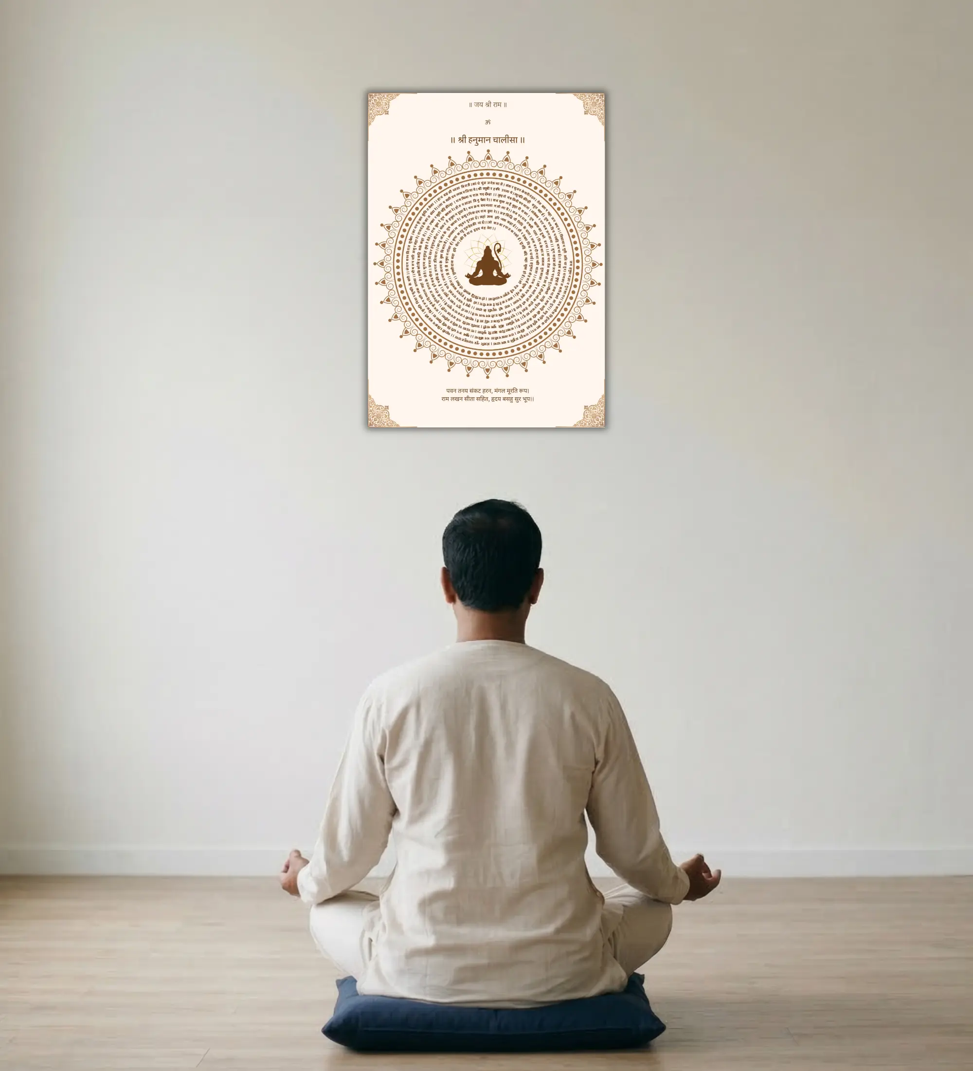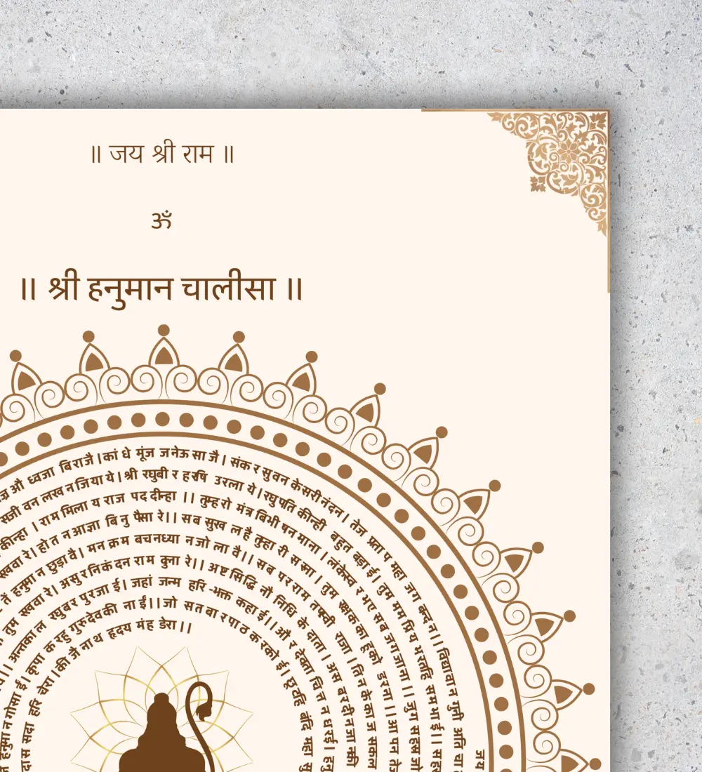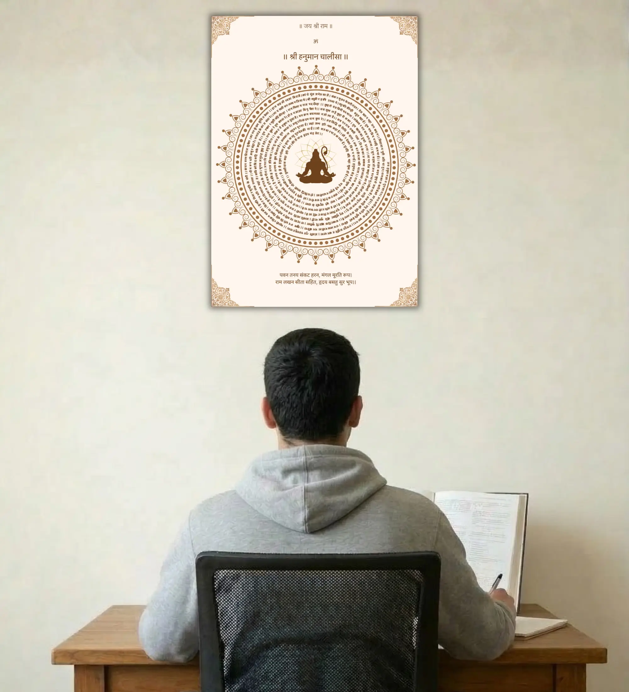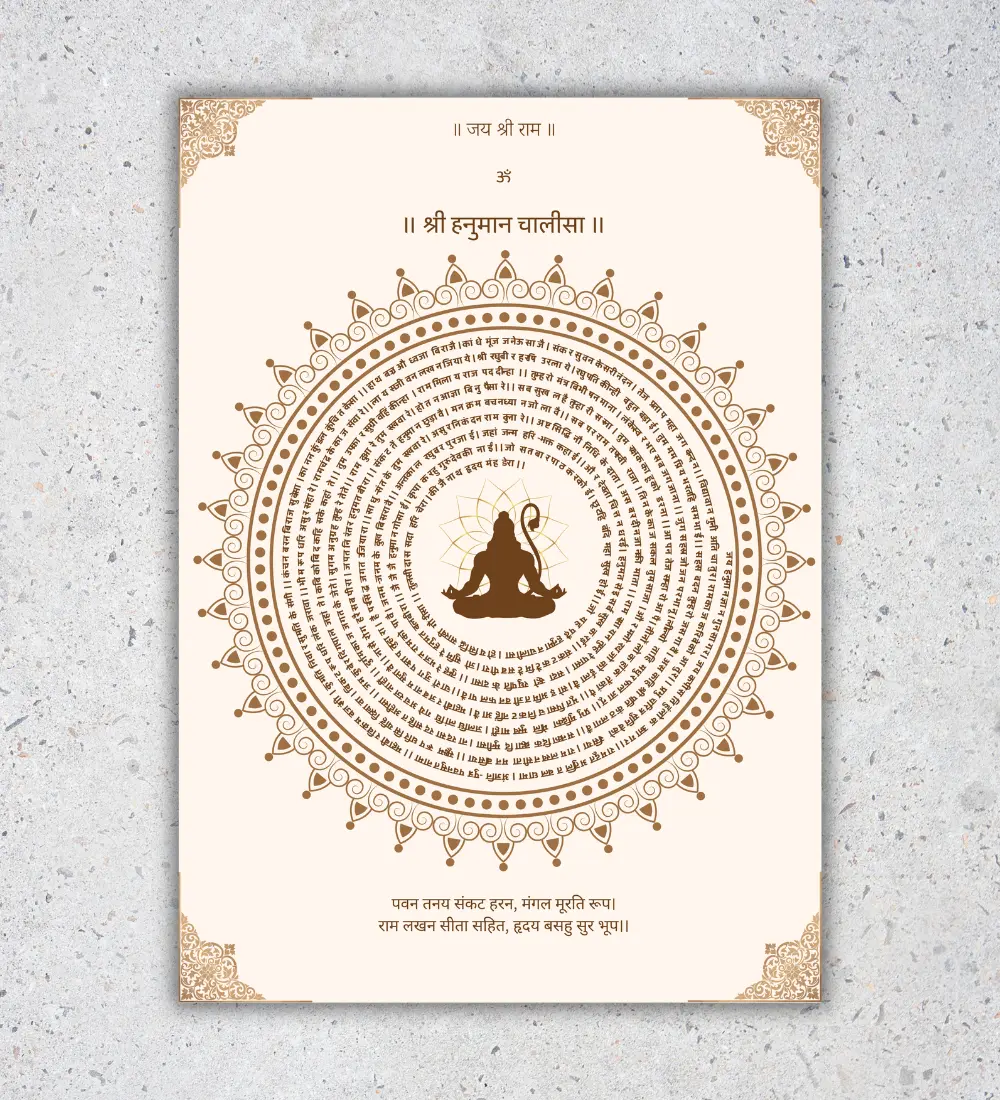 The circular design represents harmony, devotion, and the continuous flow of faith. As your eyes move through the intricate mandala, each line of the Hanuman Chalisa gently draws the mind into stillness and reflection. The warm golden tones on a soft, minimal background give the poster a peaceful and timeless aesthetic.