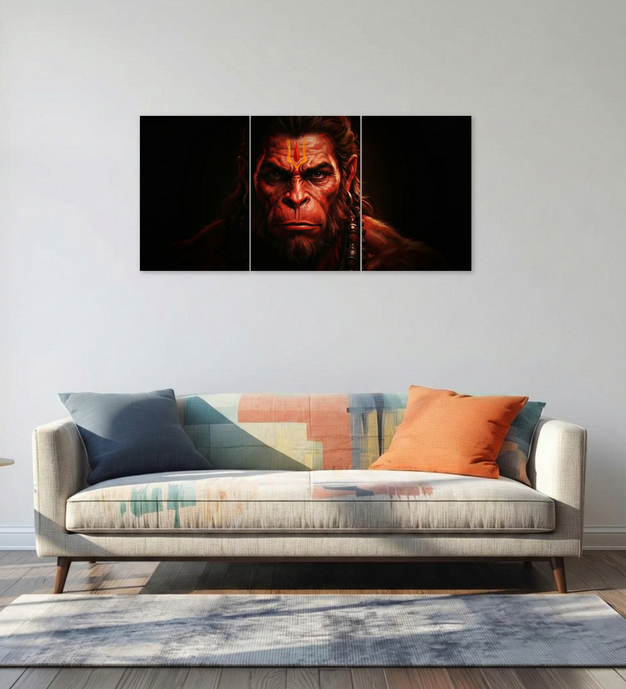 This split poster set of 3 is designed to make a quiet yet commanding statement. The artwork stretches across three panels, forming a single powerful image of Hanuman’s unwavering gaze. The central panel holds the focus, while the side panels create space, balance, and depth—making the poster feel immersive and intentional.