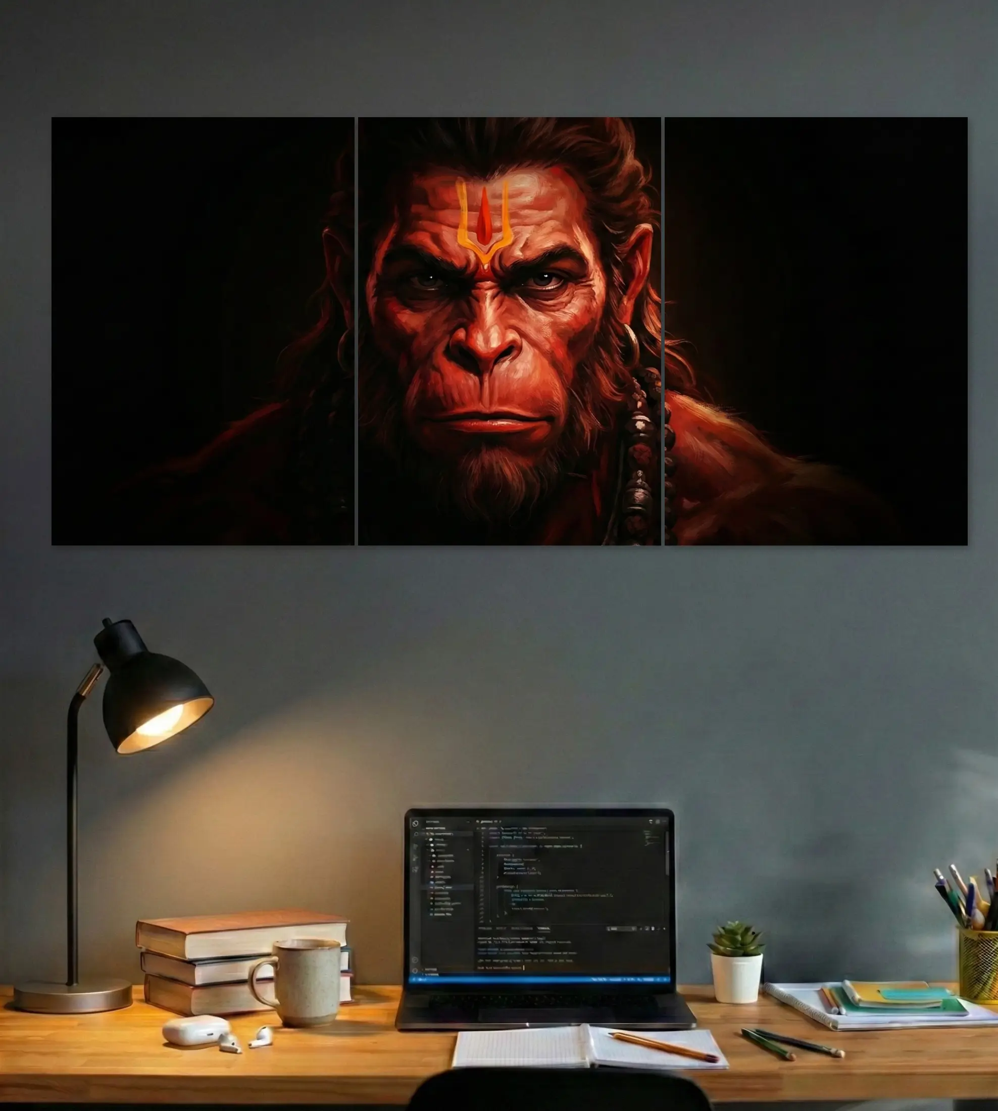 A powerful split poster set of 3 featuring Hanuman’s intense gaze across three panels. This poster set brings balance, strength, and focused energy to your space—perfect for desks, studios, and modern walls.