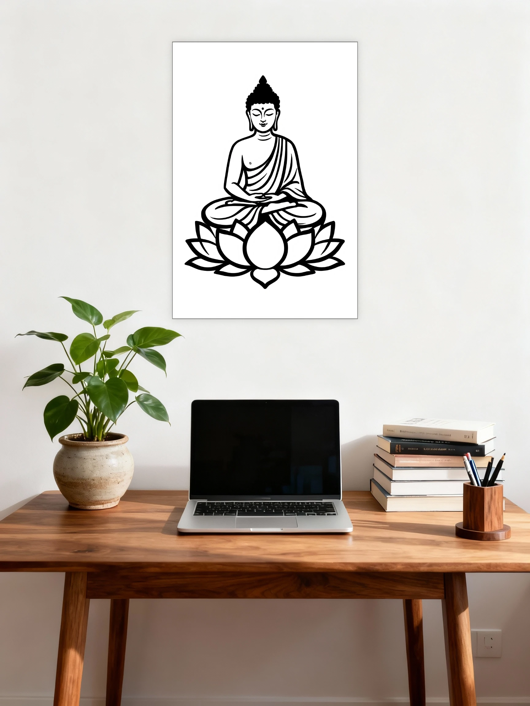 This minimalist Buddha poster uses clean black line art and open space to create a sense of calm and balance. A timeless poster designed to bring simplicity, mindfulness, and quiet focus into your space.