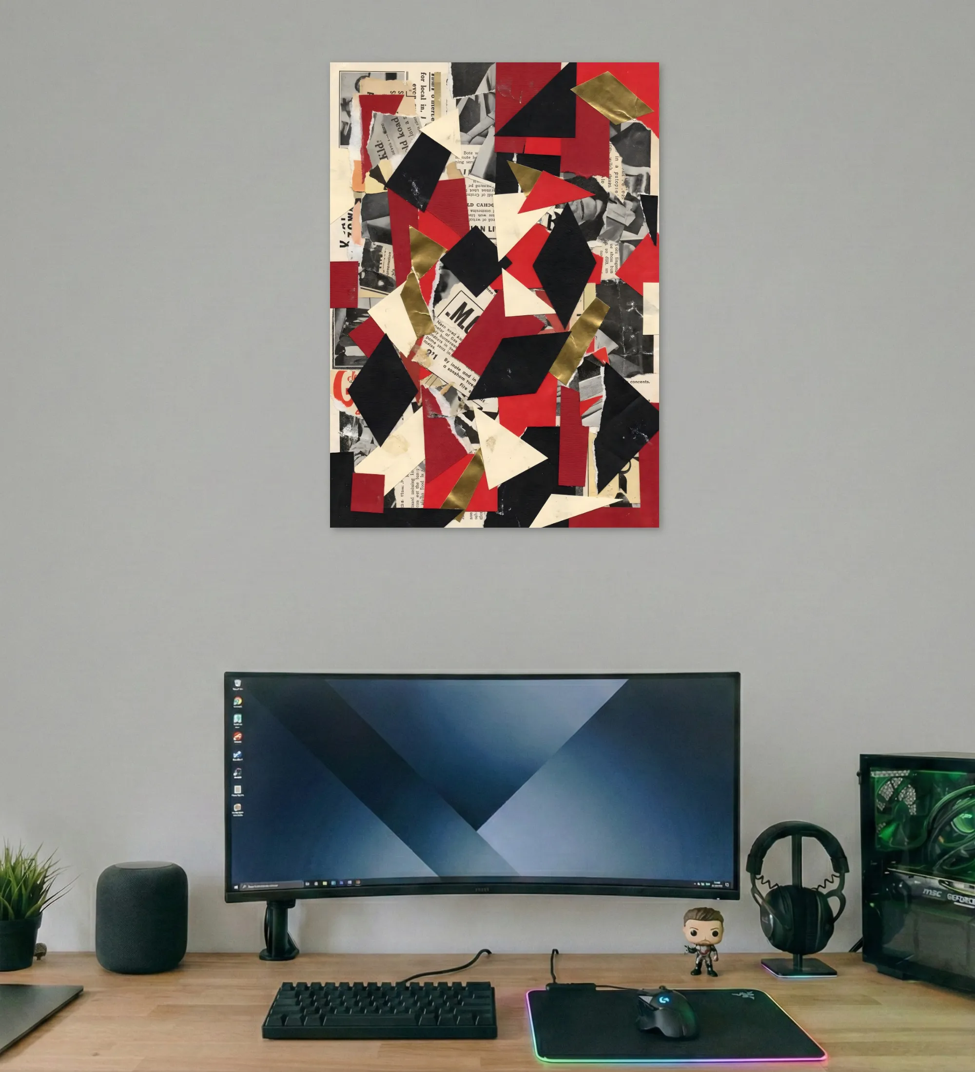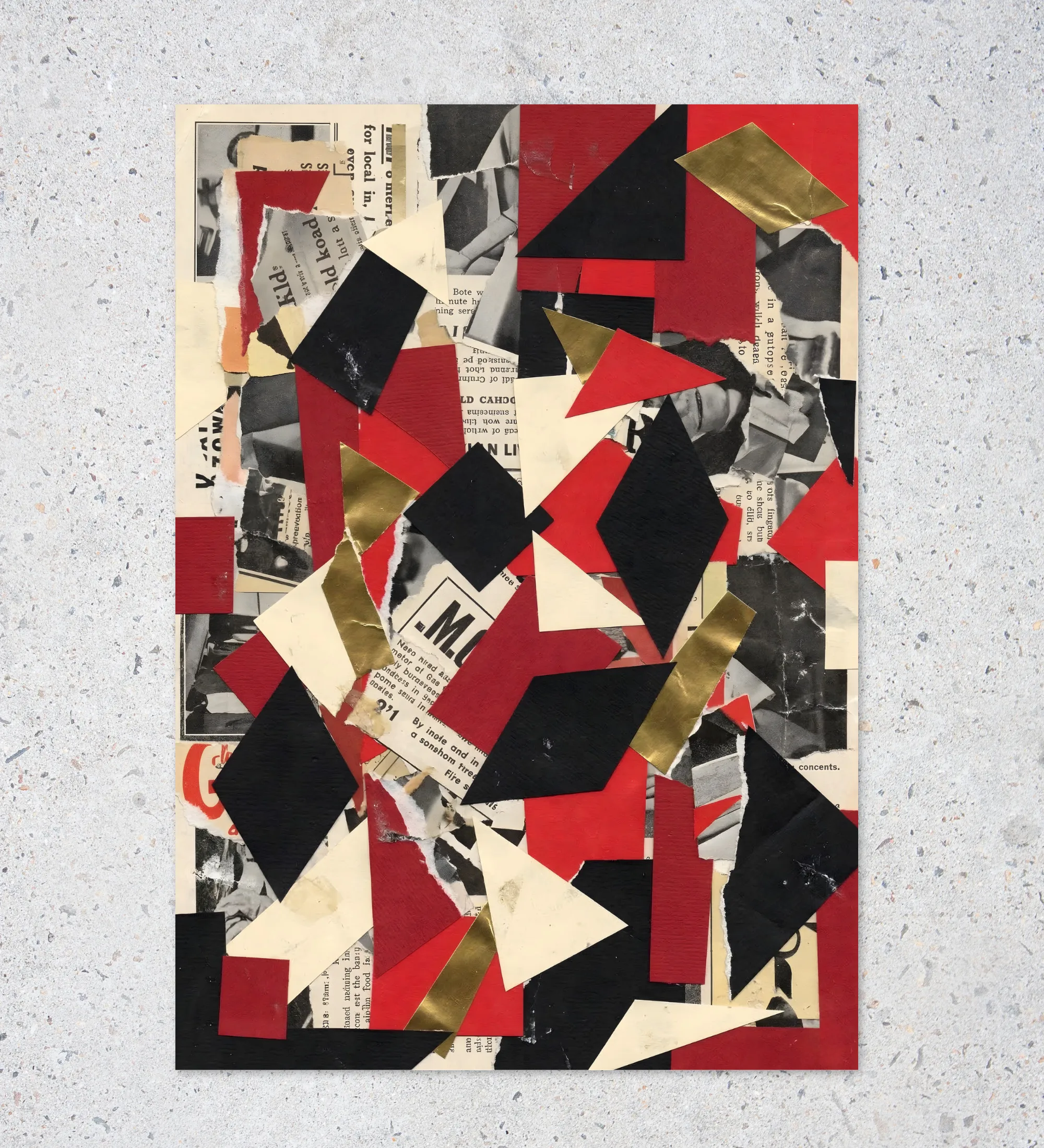 A bold abstract poster that turns chaos into design. Sharp geometric shapes in red, black, cream, and metallic gold collide over vintage newspaper textures, creating a dynamic collage that feels raw, artistic, and modern. This poster adds a striking, gallery-inspired energy to creative workspaces and studios.