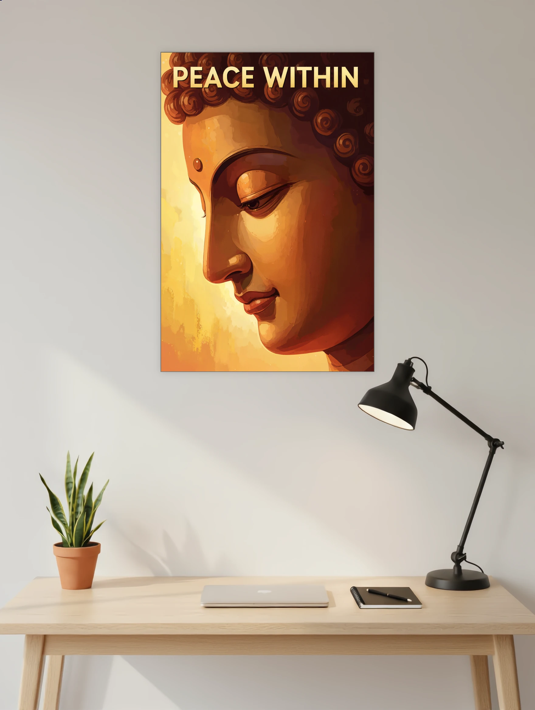 This Peace Within poster radiates warmth, calm, and quiet reflection through a golden Buddha portrait. A soothing poster designed to remind you that true peace begins from within.