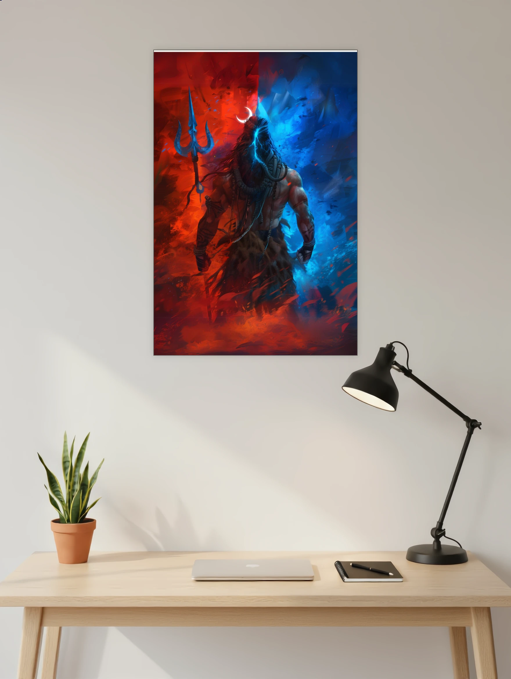 Elevate your space with the divine energy of Lord Shiva Agni Jal Backdrop Poster Immerse yourself in stunning K quality fade-proof print on – GSM Art Board OEKO-TEX Certified inks ensure safe and vibrant colors while easy installation with adhesive stripes makes decorating a breeze