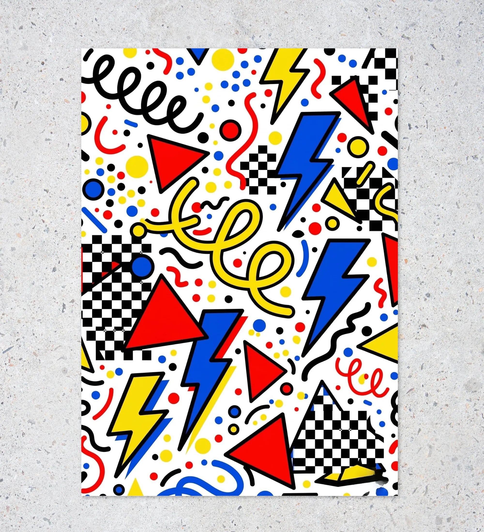 The Retro Pop Energy Poster is a burst of color, movement, and playful creativity. Inspired by retro pop art and Memphis-style design, this poster combines bold geometric shapes, lightning bolts, squiggles, and dotted patterns into one lively composition.