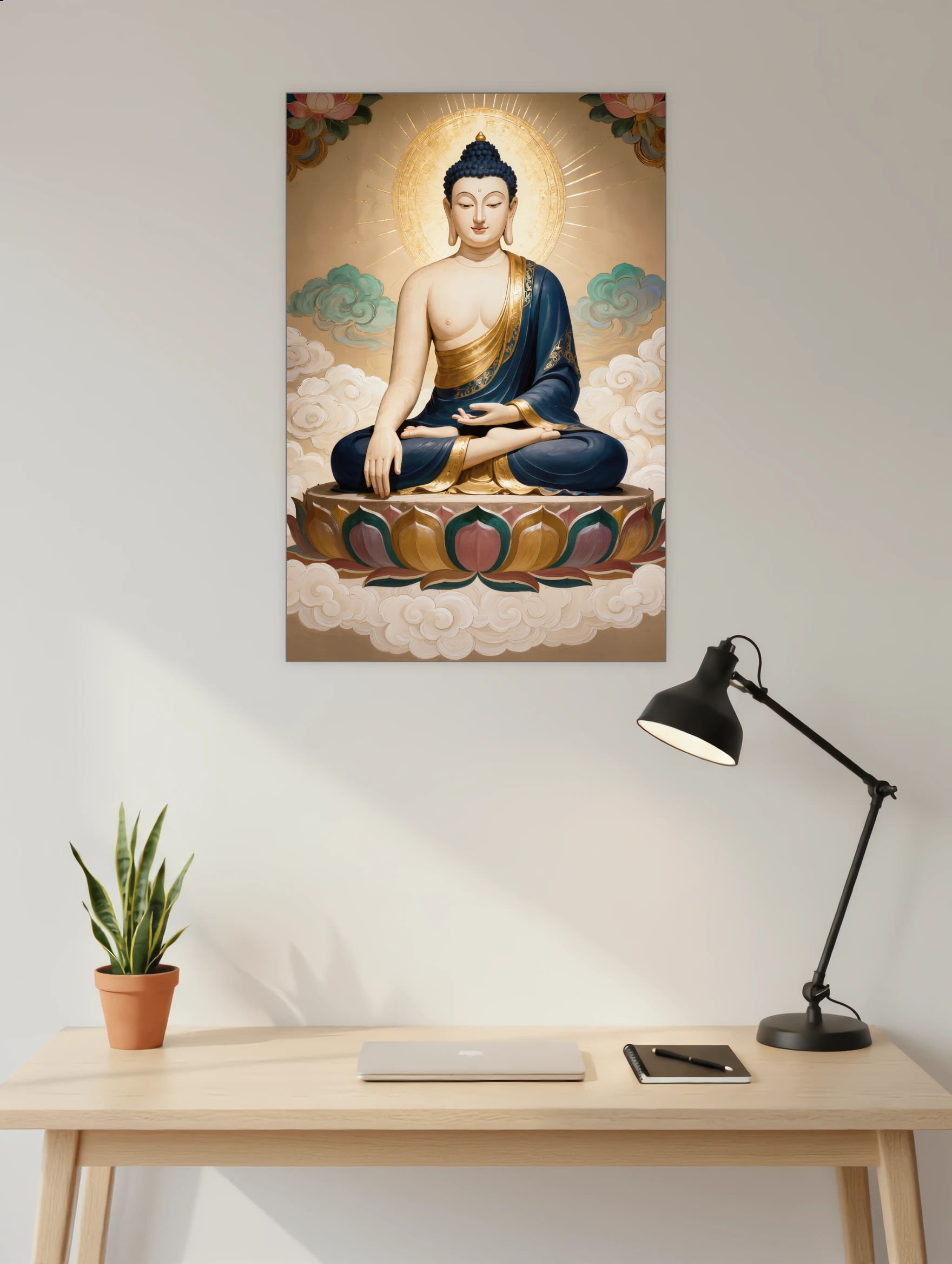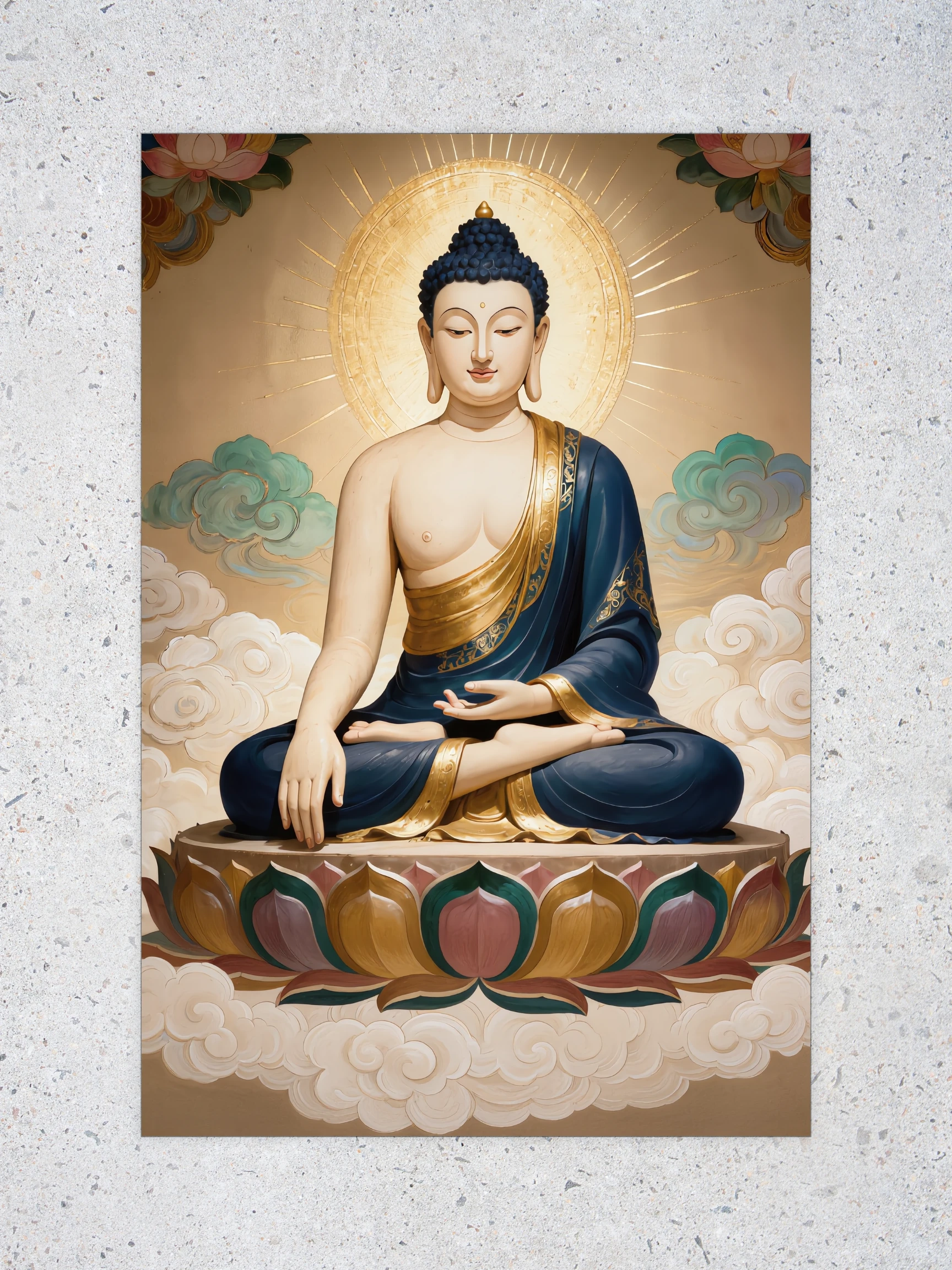 The Sacred Lotus Enlightenment Buddha poster reflects a moment of divine stillness and spiritual clarity. Seated upon a blooming lotus and surrounded by soft clouds and a radiant halo, the Buddha symbolizes awakening, compassion, and inner harmony. The rich blues, warm golds, and gentle earth tones create a sense of sacred calm that feels both grounding and uplifting.