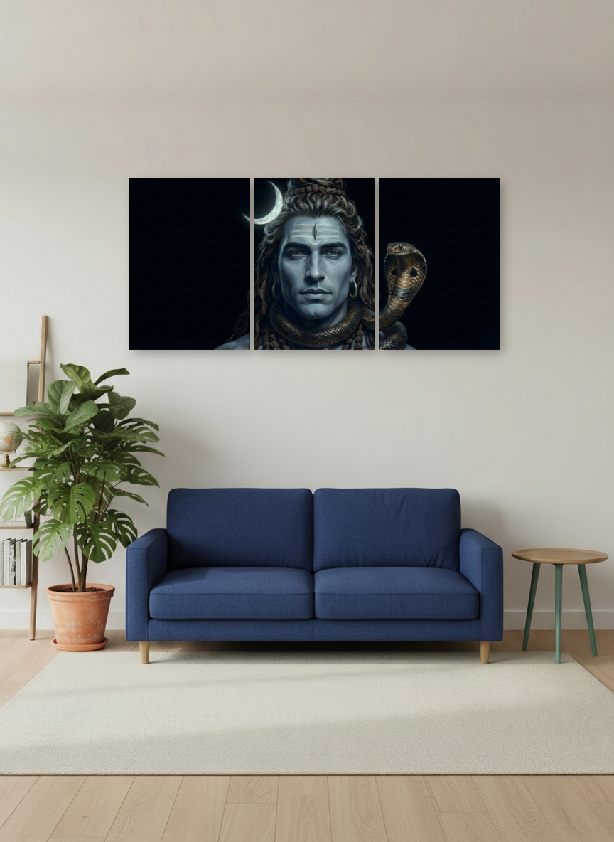 There’s a certain calm that only comes from within — steady, silent, and unshakable. The Shiva Serenity Moonlight Poster captures that exact presence. Set against deep midnight blues, Lord Shiva’s composed expression, crescent moon, and coiled serpent symbolize awareness, power, and absolute balance.