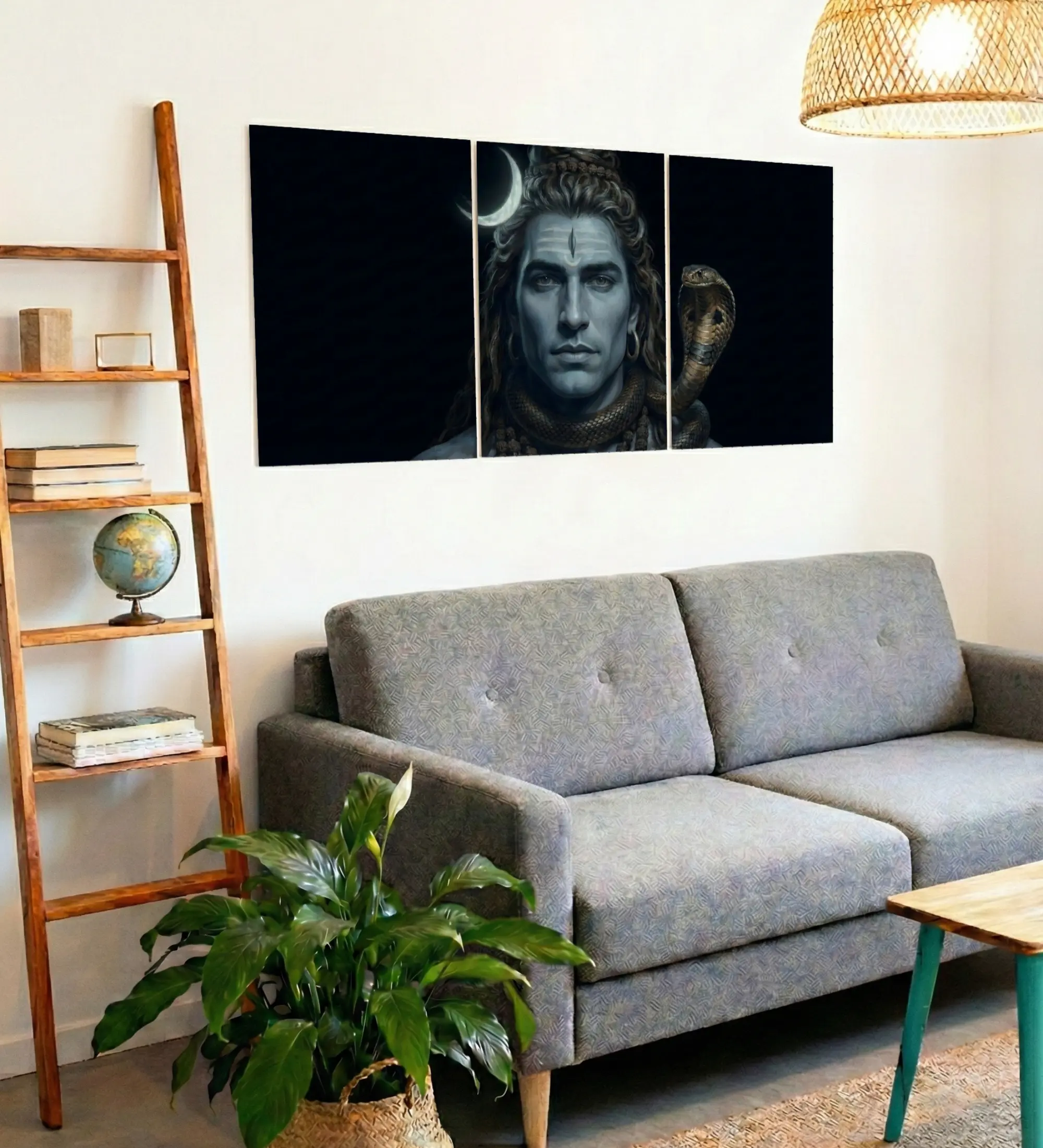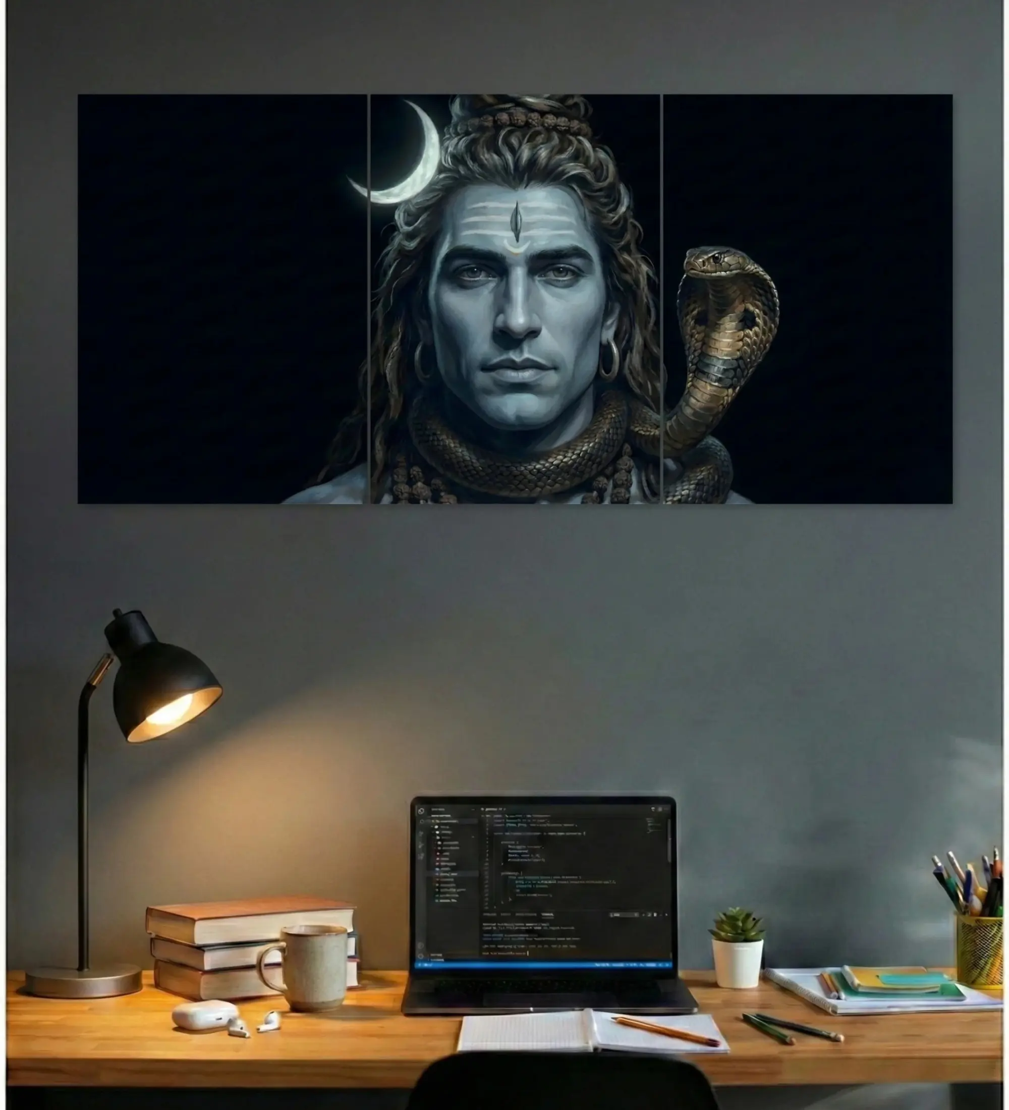 A powerful yet calming poster capturing Lord Shiva in deep stillness beneath the crescent moon. With rich midnight tones and striking detail, this poster brings focus, strength, and quiet energy into your workspace or room.