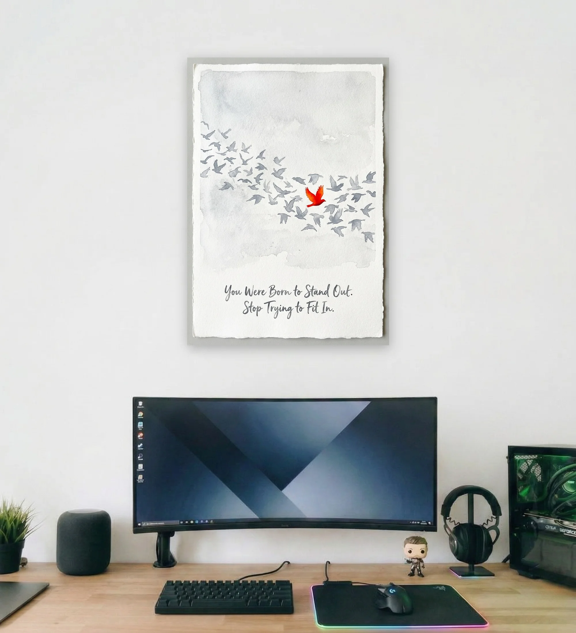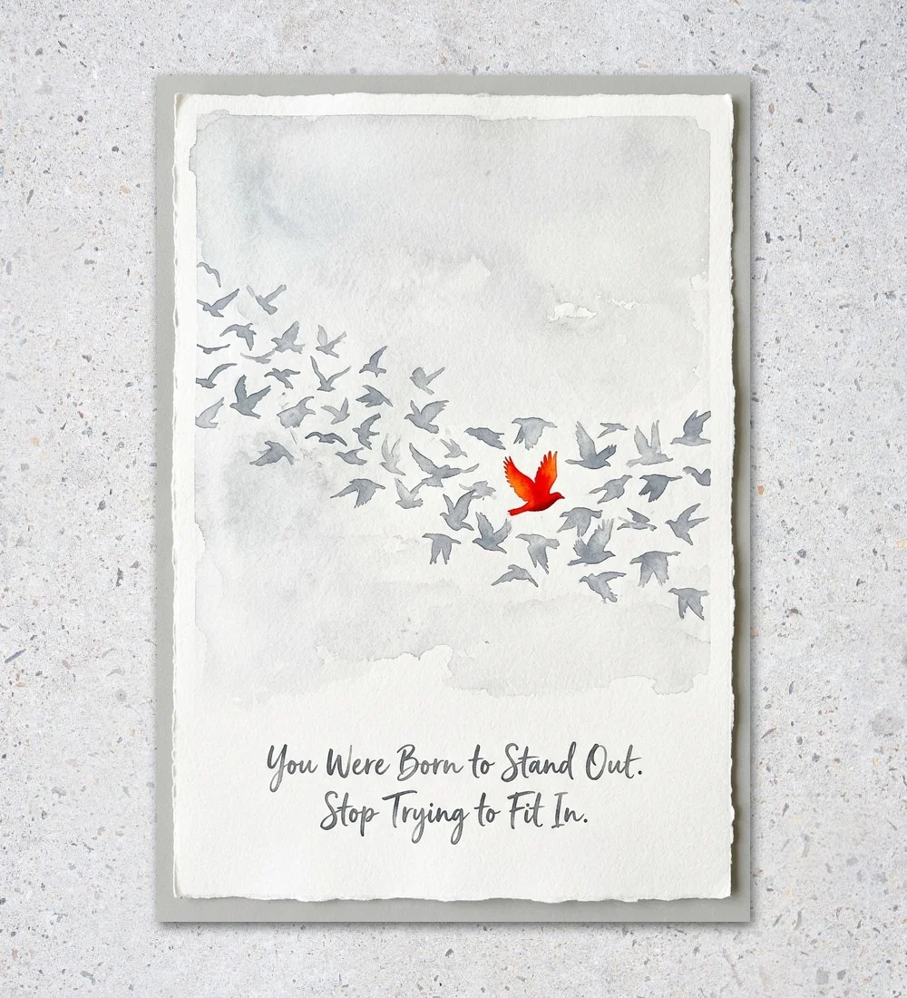 This poster tells a quiet yet powerful story of individuality. A flock of muted grey birds moves together in harmony—yet one bold red bird breaks away, standing out with confidence and purpose. Paired with the message, “You were born to stand out. Stop trying to fit in,” this poster becomes a gentle but constant reminder to embrace who you truly are.
