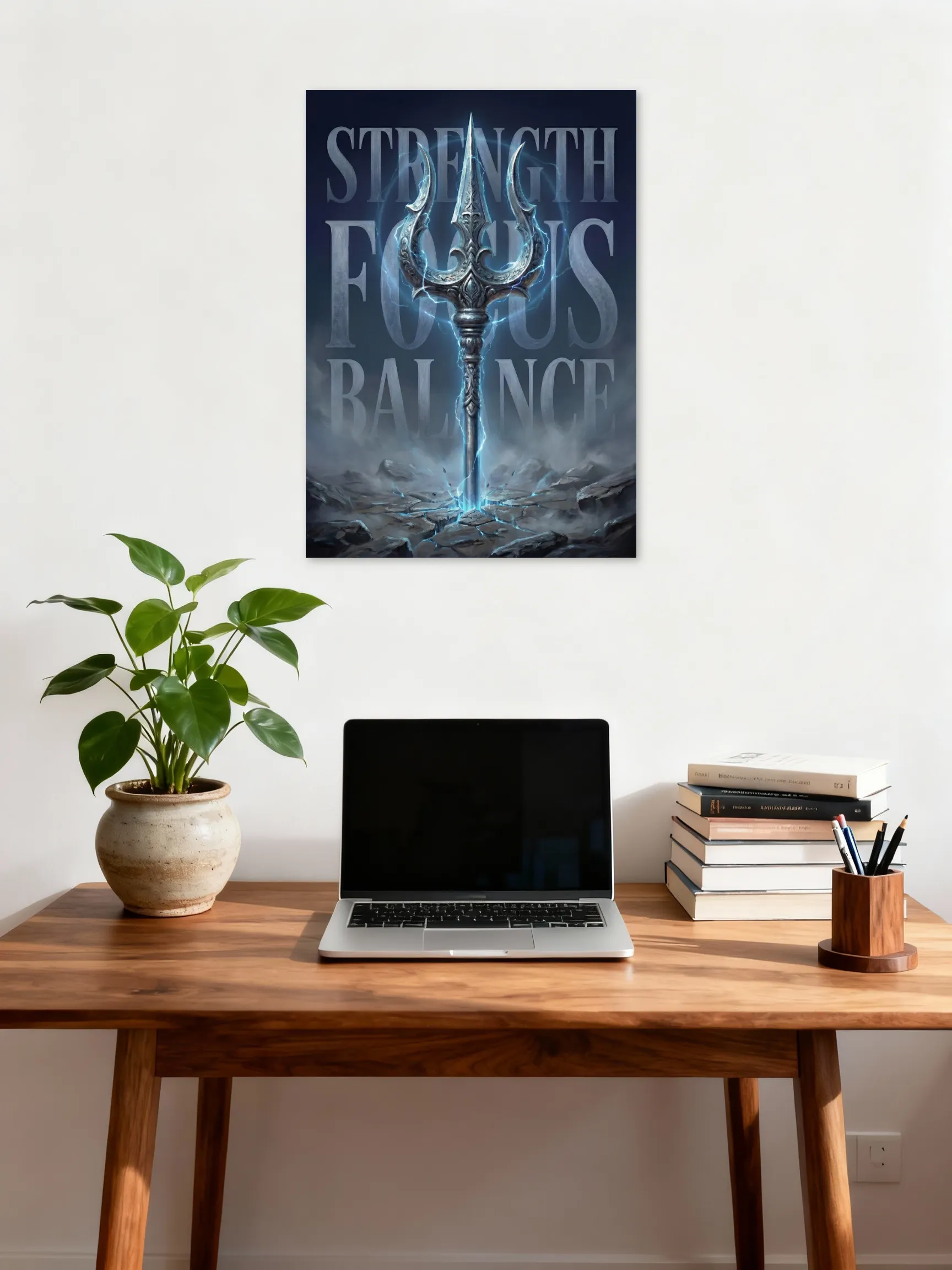 The icy tones and electric highlights create a focused, high-performance vibe — perfect for study desks, gaming setups, and modern workspaces. The words “Strength, Focus, Balance” stand tall behind the trishul, subtly reinforcing the mindset that true growth is built on discipline, clarity, and inner control.
