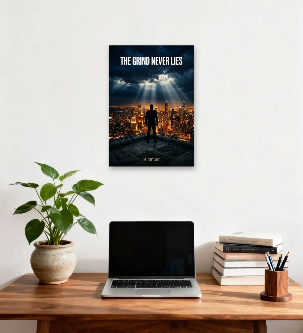 Bring the focus and determination of The Grind Never Lies into your space with this cinematic warrior-style motivational poster from Aurantara.