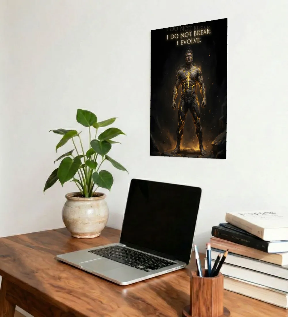 The words “I do not break. I evolve.” aren’t just a quote on this poster—they feel like a mindset shift. It’s the kind of reminder you need during long nights, tough days, or moments of doubt. Whether you’re building something, studying, or simply trying to stay consistent, this poster adds a quiet but powerful presence to your space.